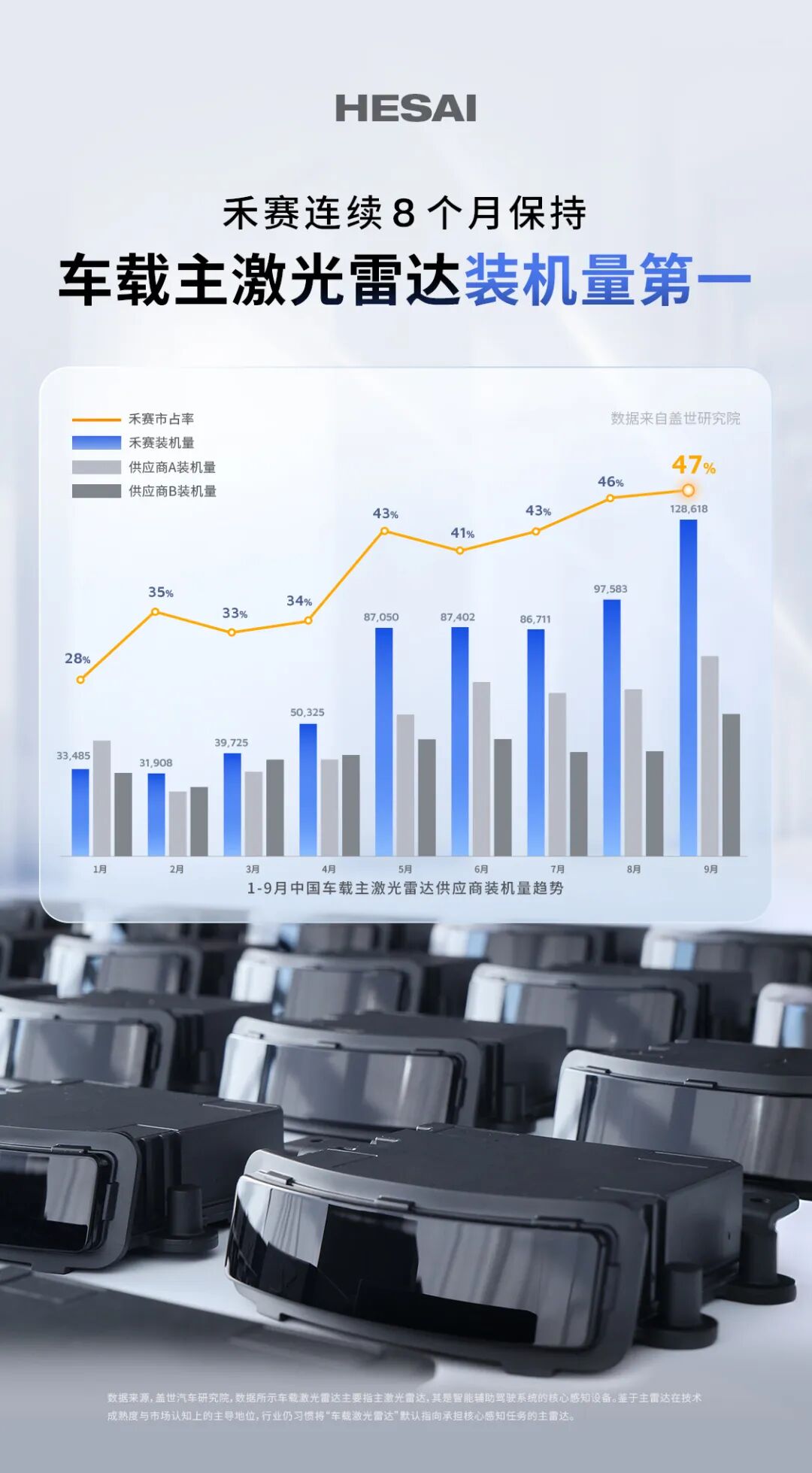 此外,禾赛 9 月底刚刚达成了当年累计量产超 100 万台目标,9 月份单月产量和全球交付量也历史首次突破 20 万台。本周盖世汽车研究院发布的 2025 年 1-9 月中国车载激光雷达装机量排行榜显示,9 月份禾赛车载主激光雷达装机量继续稳居行业第一。禾赛已连续 8 个月中国主激光雷达市占率第一并继续保持高速增长,9 月市占率已上升到 47%。