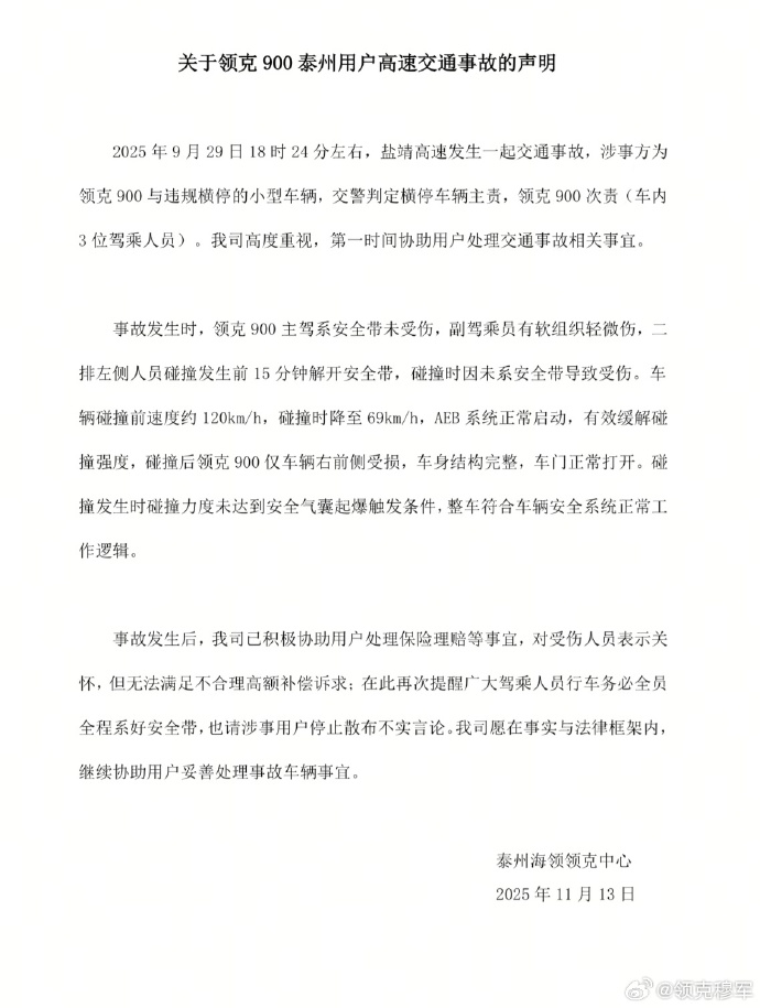 对此,领克 11 月 13 日发布《关于领克 900 泰州用户高速交通事故的声明》,称事故发生时,领克 900 主驾系安全带未受伤,副驾乘员有软组织轻微伤,二排左侧人员碰撞发生前 15 分钟解开安全带,碰撞时因未系安全带导致受伤。车辆碰撞前速度约 120km/h,碰撞时降至 69km/h,AEB 系统正常启动,有效缓解碰撞强度,碰撞后领克 900 仅车辆右前侧受损,车身结构完整,车门正常打开。碰撞发生时碰撞力度未达到安全气囊起爆触发条件,整车符合车辆安全系统正常工作逻辑。