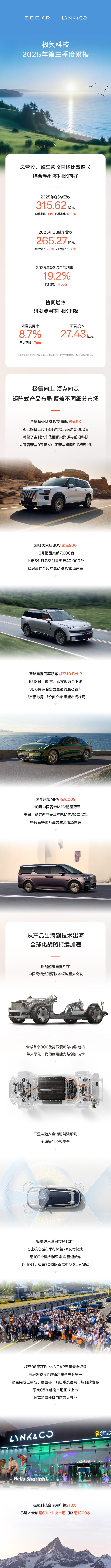 凤凰网科技讯 11月17日,极氪科技发布2025年第三季度财报。公司总营收达315.62亿元,同比增长9.1%,环比增长15.1%;
