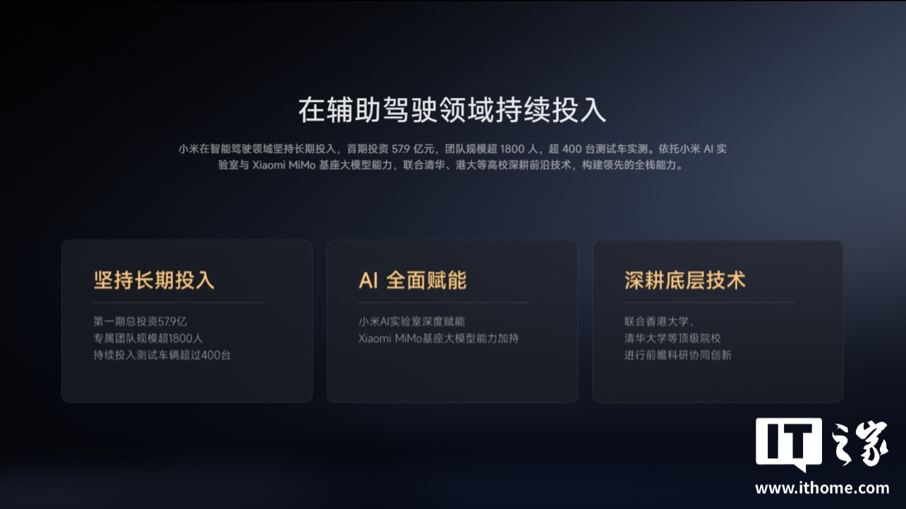 这意味着 Xiaomi HAD 辅助驾驶将在本月或 12 月升级 XLA 端到端架构。据小米官方介绍,其在智能驾驶领域坚持长期投入,首期投资 57.9 亿元、团队规模超 1800 人、超 400 台测试车实测,由小米 AI 实验室深度赋能、Xiaomi MiMo 基座大模型能力加持,并联合清华、港大等高校进行前瞻科研协同创新。