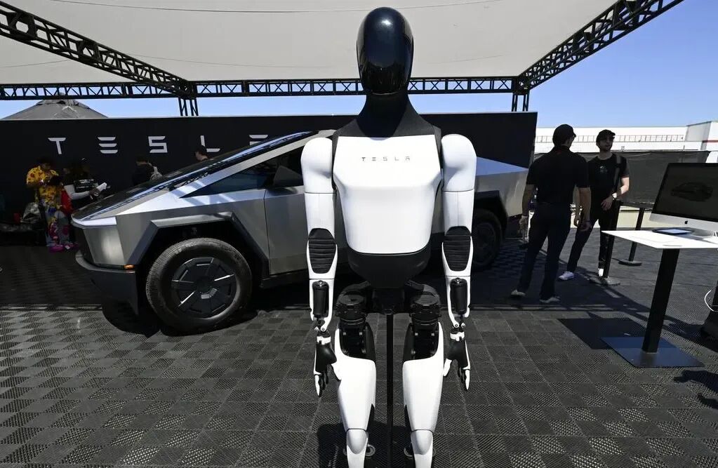 8月23日,加利福尼亚州阿拉米达市,一台Optimus机器人站在一辆Cybertruck前。图片来源:Anadolu via Getty Images