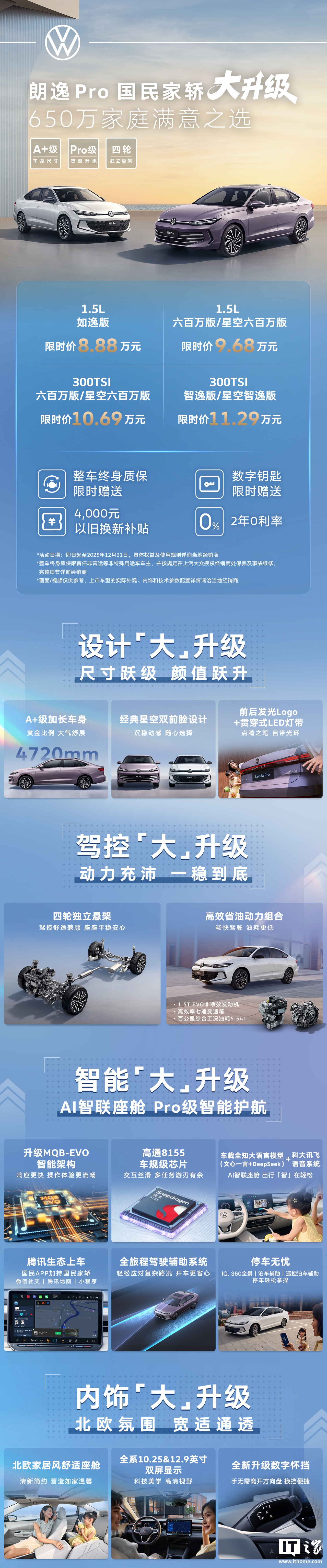 IT之家 11 月 17 日消息,上汽大众旗下全新车型朗逸 Pro 正式上市,共推出 4 款车型,限时售价区间为 8.88 万至 11.29 万元。目前,朗逸家族已涵盖朗逸新锐、朗逸、朗逸 Pro 三个系列产品,全系指导价 7.999 万元起。