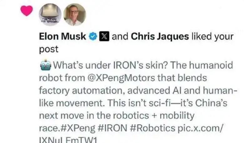 11月5日,小鹏汽车在广州发布新一代IRON人形机器人。马斯克随后在社交媒体上点赞了关于小鹏机器人的视频,还表示:“特斯拉和中国公司将主导市场。”
