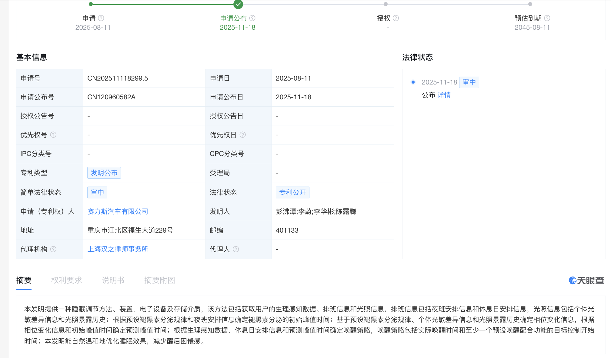 凤凰网科技讯 11月18日,天眼查显示,赛力斯汽车有限公司申请的“一种睡眠调节方法、装置、电子设备及存储介质”专利公布。