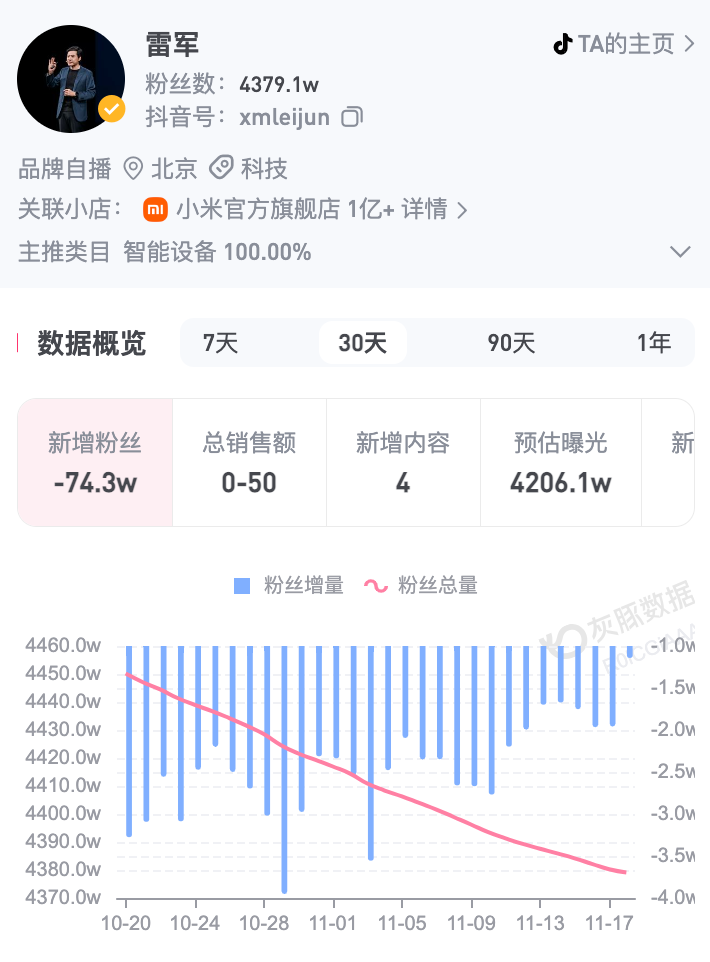 灰豚数据显示,最近一个月,雷军的抖音账号掉粉超74万,最新粉丝数降至4379.1万。