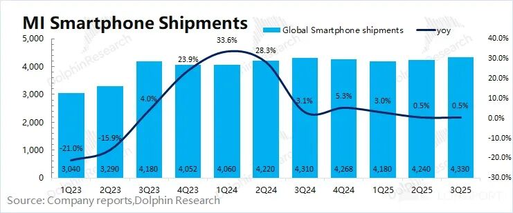 量:本季度小米智能手机出货量 4330 万台,同比增长 0.5%。
