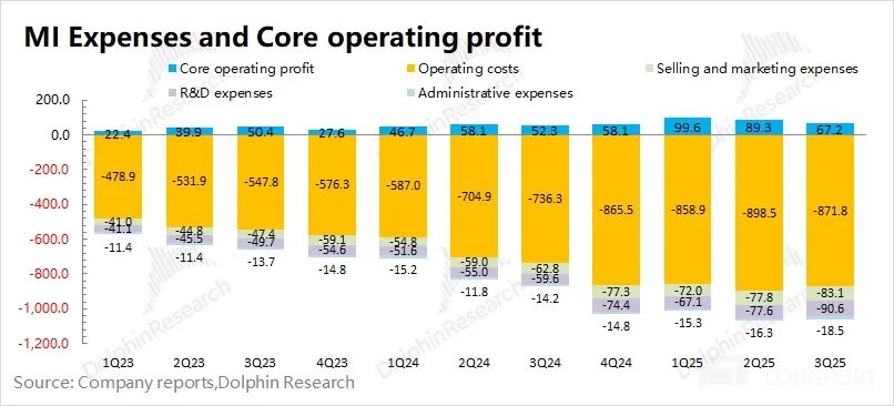 2025 年第三季度小米三项费用合计 192 亿元,费用率回升至 17%。其中一部分是因为汽车业务导致的,汽车业务经营费用继续增加值 67 亿。