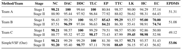 在最终榜单的Private_test_hard分割数据集上,浪潮信息AI团队提出的SimpleVSF框架在排行榜上获得了第一名,取得了53.06的总EPDMS分数。对于Stage I,它在TLC(交通灯合规性)上获得了100分,在DAC(可驾驶区域合规性)和 DDC(驾驶方向合规性)上获得了99.29分,这展示了模型的鲁棒性及其对关键交通规则的遵守能力。对于Stage I和Stage II,浪潮信息AI团队的NC(无过失碰撞)分数在所有参赛团队中处于领先地位。虽然其他方法可能在某些方面表现出色,但浪潮信息AI团队的SimpleVSF在指标上实现了综合平衡。