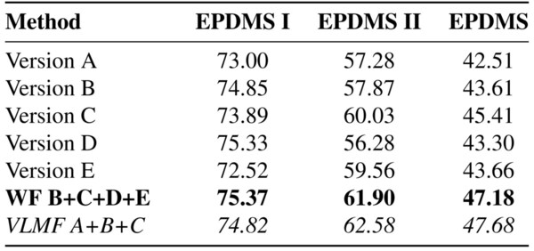 在轨迹融合策略的性能方面,通过融合策略,浪潮信息AI团队观察到了最显著的性能提升。WF B+C+D+E在Navhard数据集上取得了47.18的EPDMS得分。最终,浪潮信息AI团队在Private_test_hard分割数据集上也使用了这四个评分器的融合结果。VLMF A+B+C也取得了令人印象深刻的 EPDMS 47.68,但由于提交规则限制,未在最终的排行榜提交中使用此融合策略。