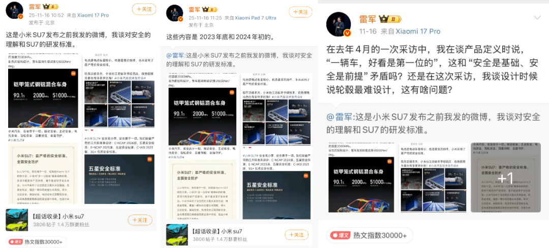 11月16日,小米集团CEO雷军连发多条微博,重申小米汽车的安全设计理念,并对此前“一辆车,好看是第一位的”等受到争议的言论做了回应。