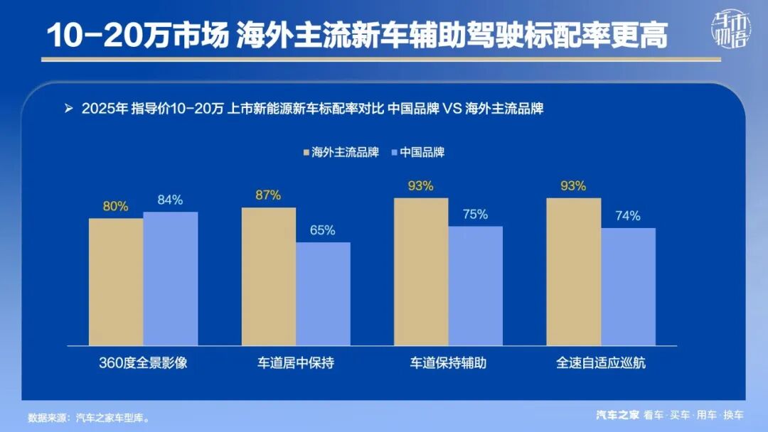 对比新车投放占比最大,也是增长最高的10-20万级别市场。如今,海外主流新能源新车的配置标配率不再是短板。