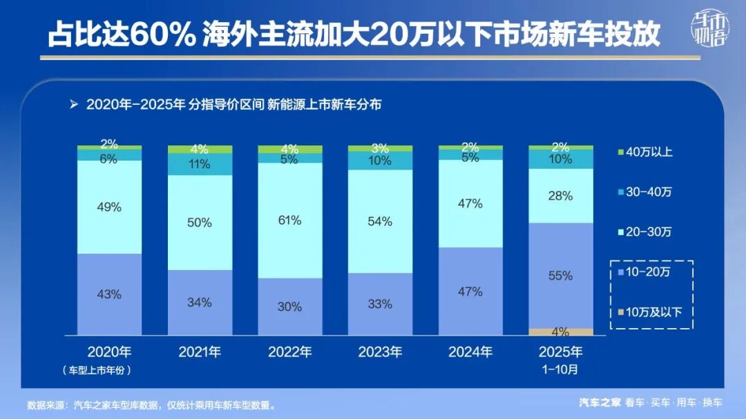 分指导价区间来看,海外主流品牌主要加大了20万以下经济型市场的新车投放力度。至2025年1-10月,指导价20万以下的新能源新车型数量占比提升至60%。此外,还开辟了更低价位的细分市场,推出了10万及以下新车型,占比4%,这架势,无异于是向中国品牌全面宣战。