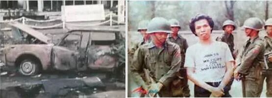 1974年排日运动的老照片,一辆被烧毁的日本车,以及一位被捕的肇事者