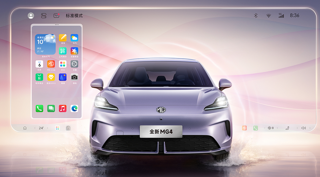 内饰方面,全新 MG4 提供蔷薇紫和黛山蓝两种配色方案,双辐式方向盘增加了加热功能,而怀挡式换挡机构和副仪表台位置的 50 瓦手机无线充电面板则进一步提升了车内的科技感和便利性。全新 MG4 还搭载了名爵与 OPPO 合作开发的智行车机互联系统,配备高通骁龙 8155 芯片,集成了手机语音备车、手车应用融合、手车无感互联、手机摇一摇导航、AI 智能融合等多项功能。