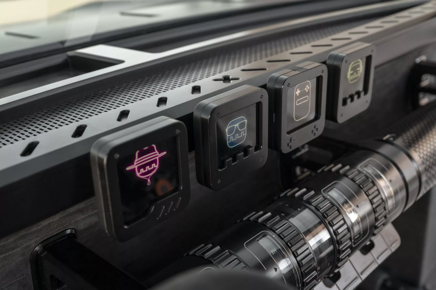 新车的整体座舱布局相当硬核,圆柱形的中控台辅以两侧的“背带”体现着颇为狂野的气质。该车没有配备大尺寸中控屏,而是用四块小尺寸屏幕取而代之,前挡风玻璃的整个下半部分都被用作 HUD 抬头显示。