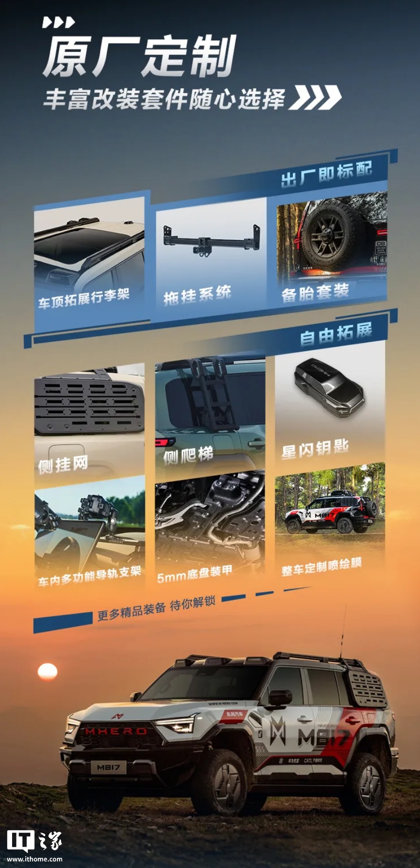 该车定位“越野改装玩家”,标配三把差速锁,大进气格栅外观配有“MHERO”英雄标识,提供 20 余处改装接口预留及拖挂系统。