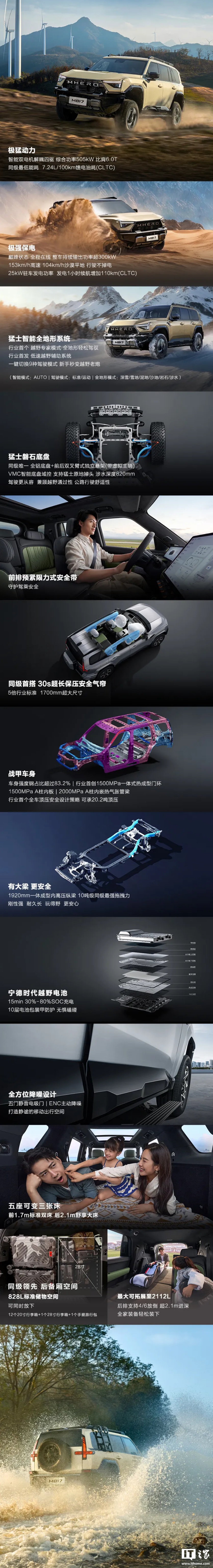 该车还配有 1920mm 一体成型内高压纵梁、前后双叉臂悬架、83.2% 高强度钢车身、31.7kWh 宁德时代越野电池(CLTC 纯电续航 140km)。