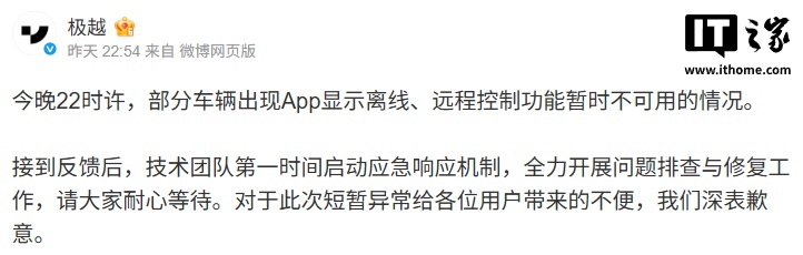 IT之家 11 月 24 日消息,昨晚 22 时许,极越部分车辆出现 App 显示离线、远程控制功能暂时不可用的情况。对此,官方进行了回应。