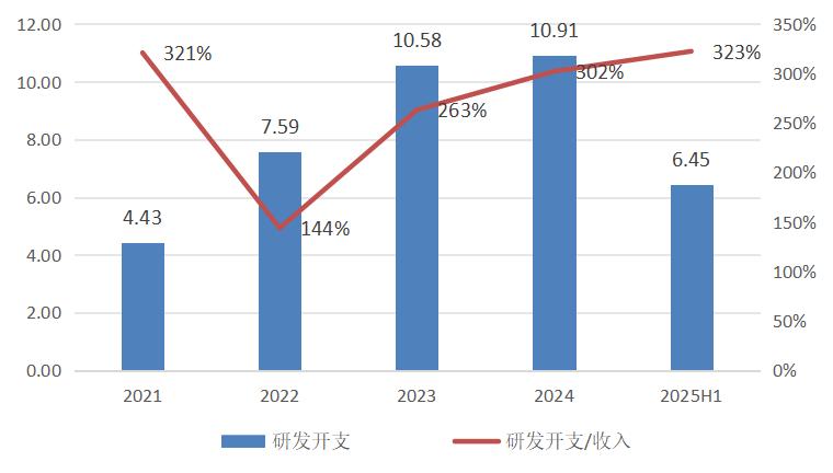 2021-2025H1文远知行研发开支及其与收入的比例(单位:亿元人民币),数据来源:文远知行财报