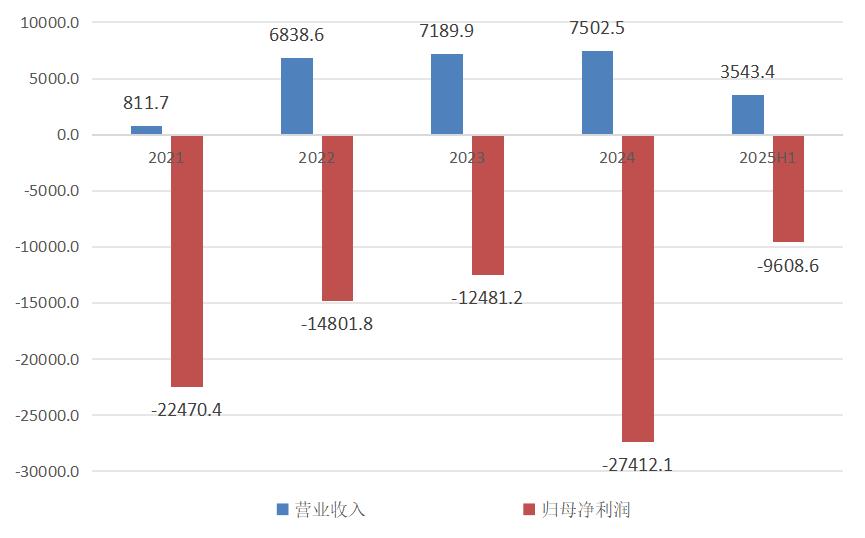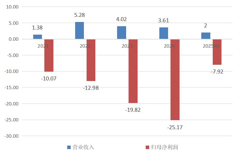 2021-2025H1文远知行营业收入与归母净利润变化(单位:亿元人民币),数据来源:文远知行财报