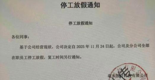 基于公司经营现状,公司决定自2025年1月24日起,公司及分公司全部在职员工停工放假,复工时间另行通知。