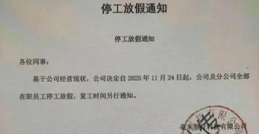上周五下班前,毫末智行公司大群突然弹出一条通知:“基于公司经营现状,自11月24日起全员停工放假,复工时间另行通知。”就这样简单一句话,没有解释,没有后续安排,更没有工资和赔偿方案。