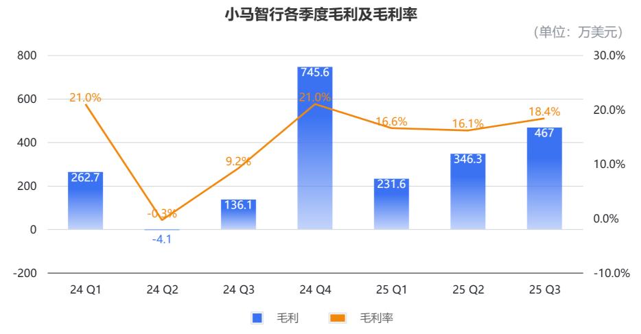 利润方面,第三季度,小马智行的毛利为467万美元(约3310万元),同比大涨243%;公司同期的综合毛利率为18.4%,是去年同期的整整两倍。