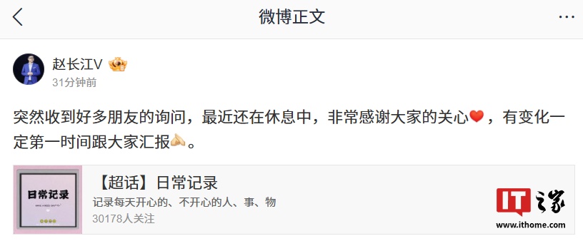 IT之家 11 月 26 日消息,前比亚迪腾势品牌总经理、腾势方程豹直营事业部总经理赵长江今日发文称:“突然收到好多朋友的询问,最近还在休息中,非常感谢大家的关心,有变化一定第一时间跟大家汇报。”