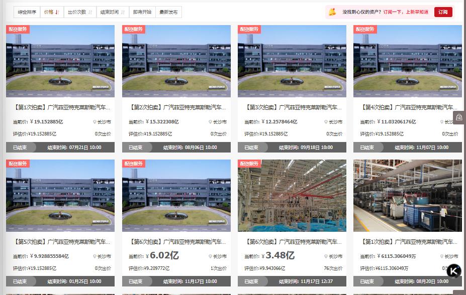 无独有偶,11月21日,已宣告破产的广汽菲亚特克莱斯勒汽车有限公司(下称广汽菲克)其长沙工厂在第六次拍卖后终于成功出手,成交价9.5亿元,较首次19.15亿元的起拍价近乎腰斩。