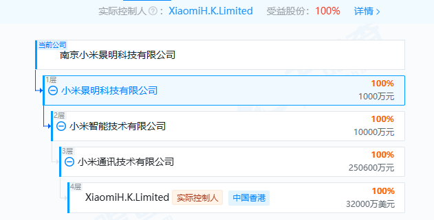 天眼查信息显示,南京小米景明科技有限公司为小米景明科技有限公司全资子公司,均成立于2023年,股权穿透后,二者的实际控制人为XiaomiH.K.Limited。