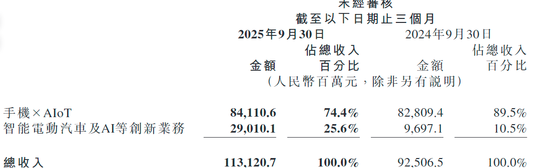 值得注意的是,今年第三季度,小米智能电动汽车及AI创新业务分部实现了首次盈利,本季度经营收益达7亿元。