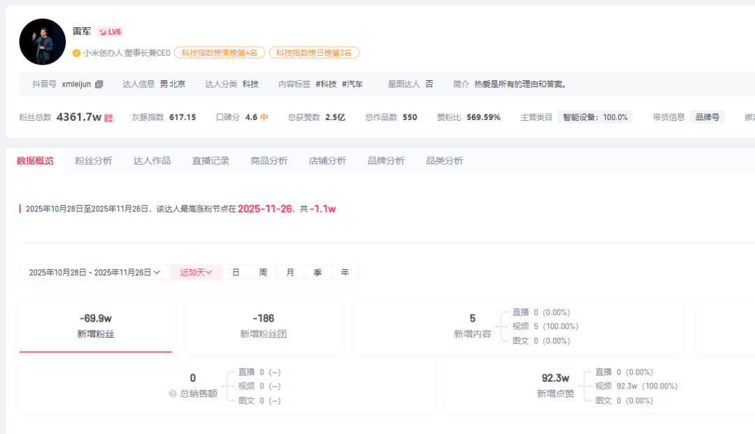 值得关注的是,雷军遭遇了“口碑危机”。灰豚数据显示,近一个月雷军掉粉69.9万。