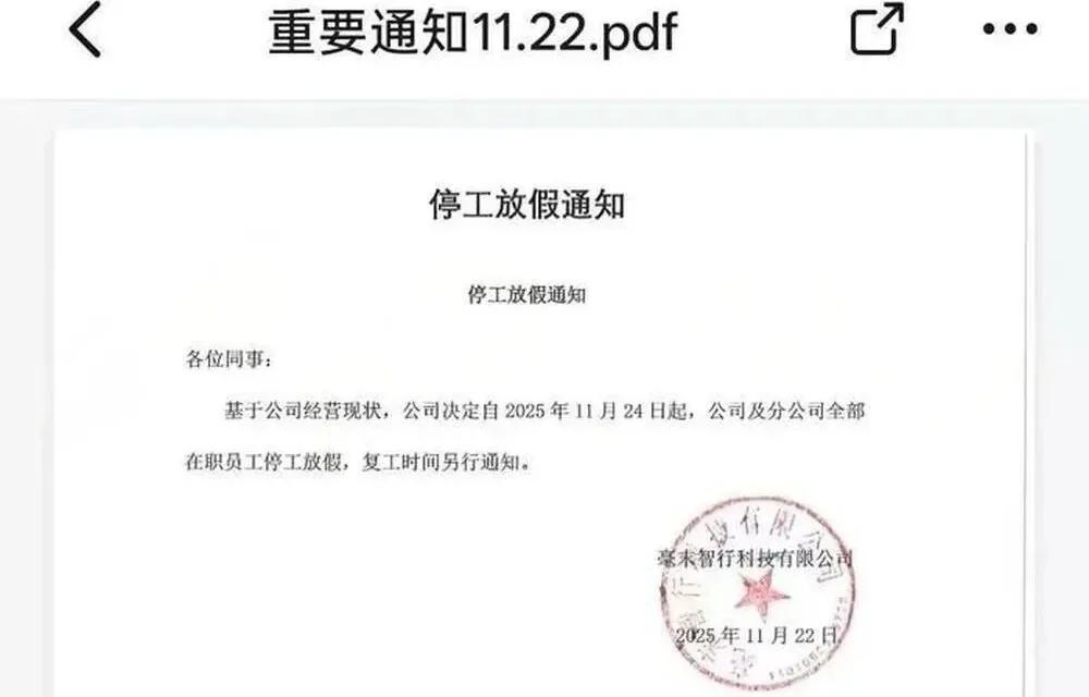 几天前,毫末智行的一纸停业通知在网络上迅速传播。通知显示:公司及分公司全部在职员工停工放假,复工时间另行通知。