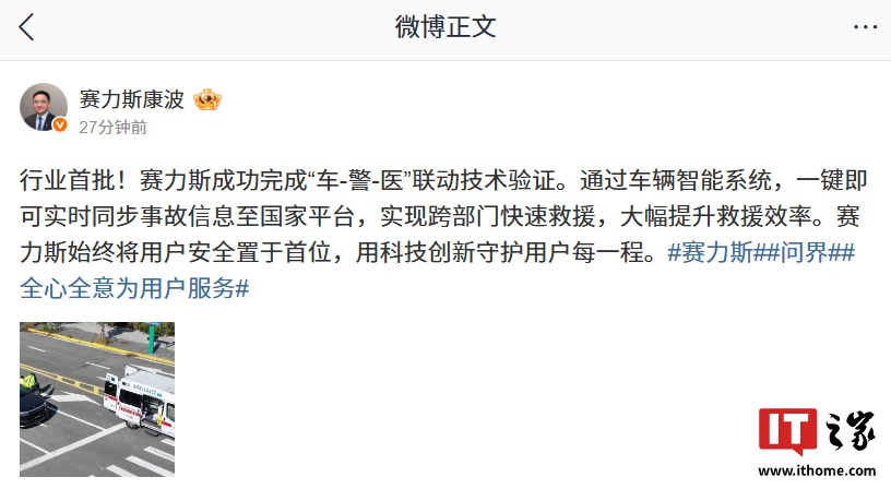 IT之家 11 月 27 日消息,赛力斯集团副总裁康波今日宣布,赛力斯行业首批成功完成“车-警-医”联动技术验证。