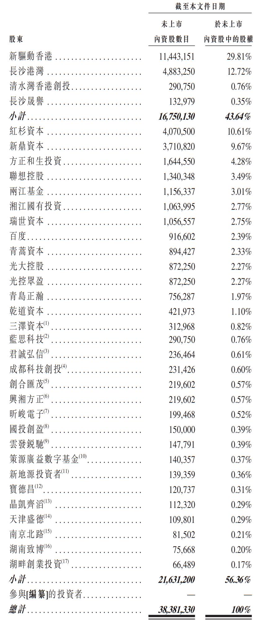 IPO前,李泽湘教授控制43.63%股权,其中,通过新驱动香港控制29.81%股权,通过长沙港湾控制12.72%股权,通过清水湾香港创投及长沙晟誉控制1.1%股权。