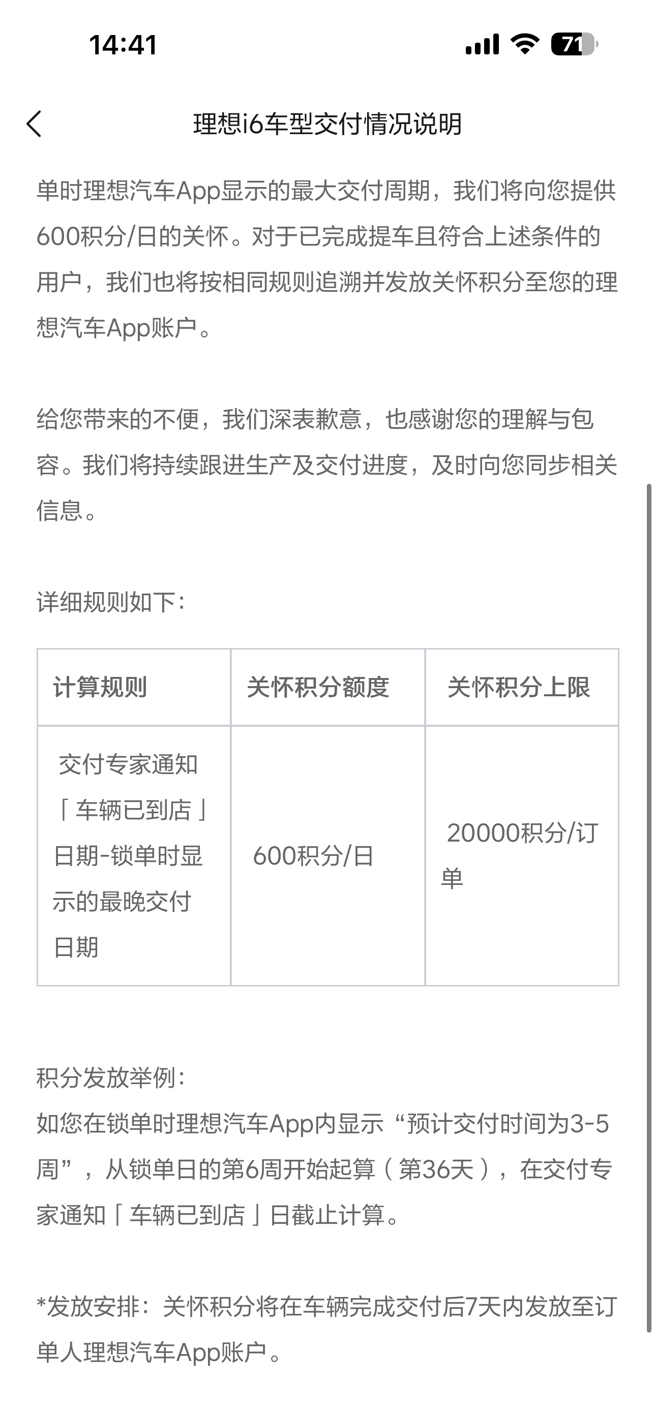 为体现企业责任与诚意,理想汽车宣布:对于因公司原因造成交付超期的用户,将按每日 600 积分的标准发放(相当于 60 元 / 天),且该政策可追溯适用于已提车用户,确保所有受影响车主获得公平、一致的关怀。