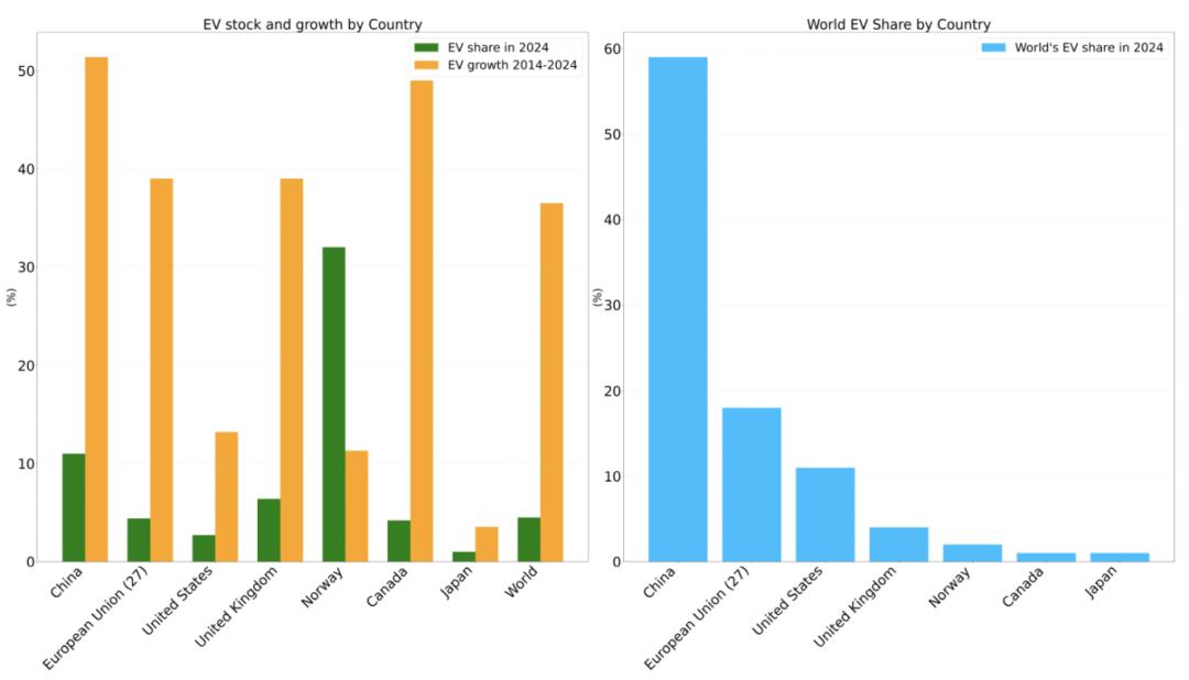 左图中,"其他"包括柴油、天然气、液化石油气及其他替代燃料。右图中,绿色柱状图显示2024年各国电动汽车占其汽车总保有量的份额,橙色柱状图表示2014年至2024年电动汽车数量的增长。右图中的蓝色柱状图显示2024年各国电动汽车占全球电动汽车总量的份额。