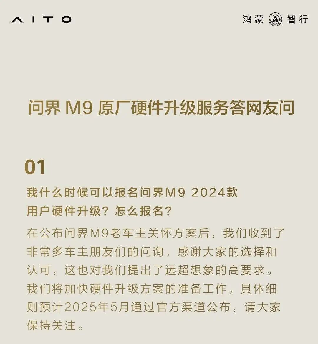 升级的成本不只在研发和硬件。今年3月,问界宣布将为问界M9现款车型车主提供可选的原厂硬件升级方案,包括智能驾驶系统、传感器、车载通讯和智能座舱模块的升级。公告中提到将在5月给出细则,但至今都没有公布后续方案。