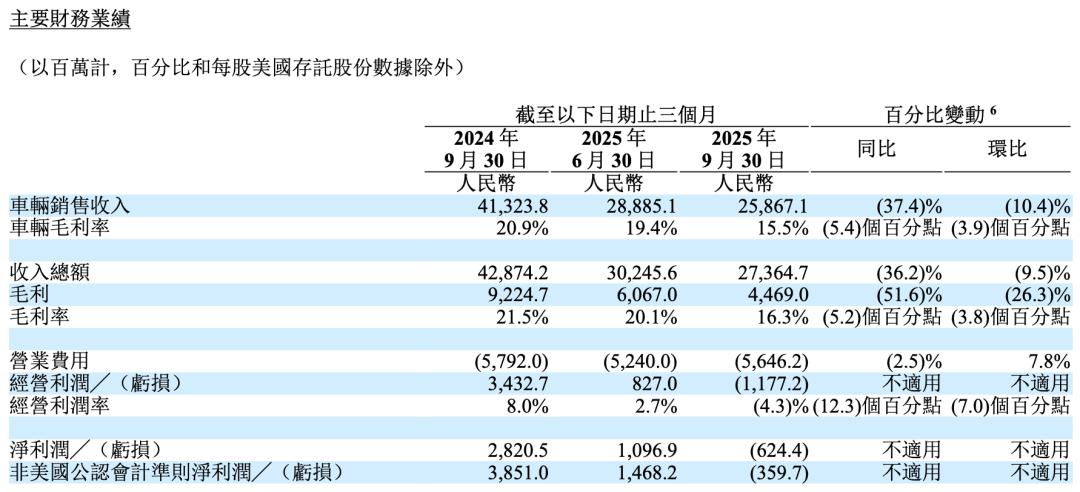 理想汽车的赚钱能力急剧下滑。2025年第三季度,理想汽车总收入为274亿元,同比下滑36.2%;由盈利转向亏损,净亏损6.24亿元,而2024年第三季度、2025年第二季度的净利润分别为28亿元、11亿元。