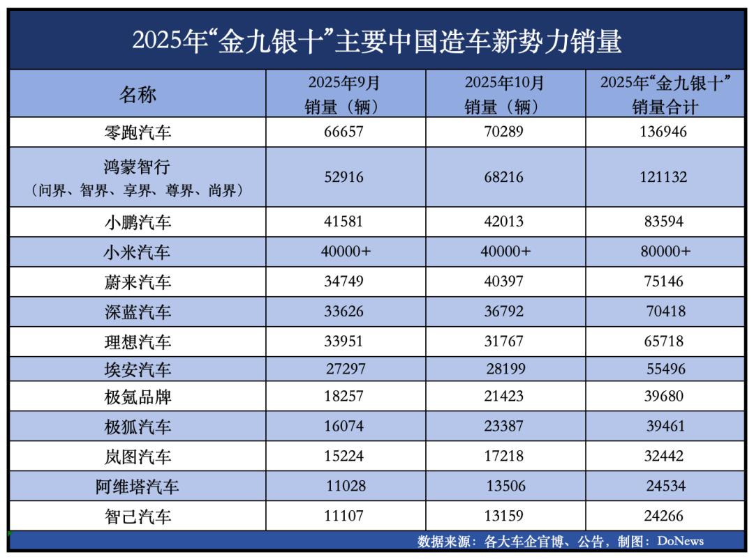 DoNews曾统计了国内13家主要造车新势力在汽车销售旺季“金九银十”(9月、10月)的销量表现,累计销量TOP5的造车新势力车企分别是零跑汽车13.69万辆、鸿蒙智行12.11万辆(含问界、智界、享界、尊界、尚界)、小鹏汽车8.36万辆、小米汽车超8万辆、蔚来汽车7.51万辆(含蔚来、乐道、firefly萤火虫),而理想汽车累计销量为6.57万辆,对比去年同期下降近4成,排在第7位。