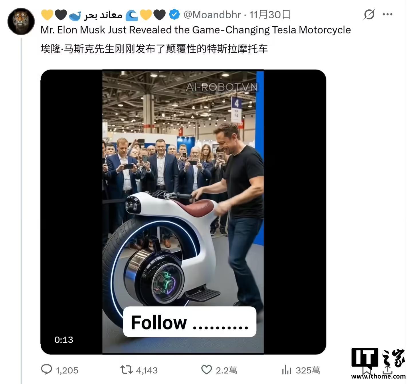 IT之家 12 月 1 日消息,X 平台用户 @Moandbhr 昨天发布了一段“马斯克骑单轮摩托车”的 AI 视频,并配文称“埃隆・马斯克先生刚发布了颠覆行业的特斯拉摩托车”,引发网友热议。