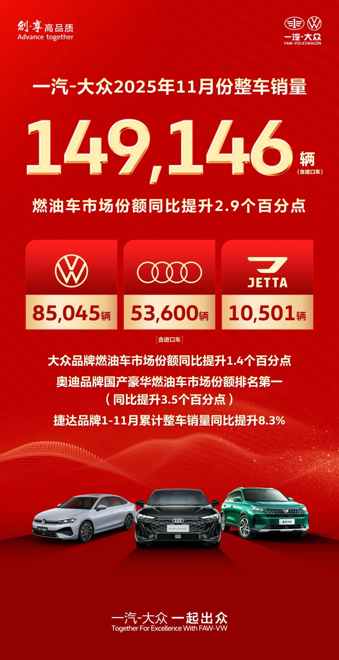 IT之家 12 月 1 日消息,一汽-大众今日发布最新销量业绩:11 月实现整车销售 149,146 辆(含进口车),燃油车市场份额同比提升 2.9 个百分点。