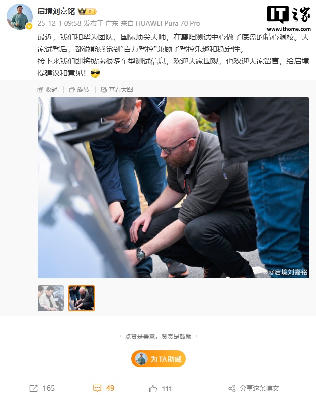 IT之家 12 月 2 日消息,启境汽车 CEO 刘嘉铭昨日表示,启境首款车型已在襄阳完成首轮骡车底盘测试。启境全系都将搭载华为乾崑数字底盘引擎。
