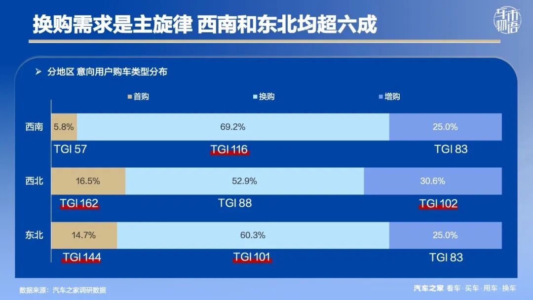 分购车类型来看,换购需求是主旋律,其中西南地区占比最高,达到69.2%,相对较低的西北地区也超过了半数。