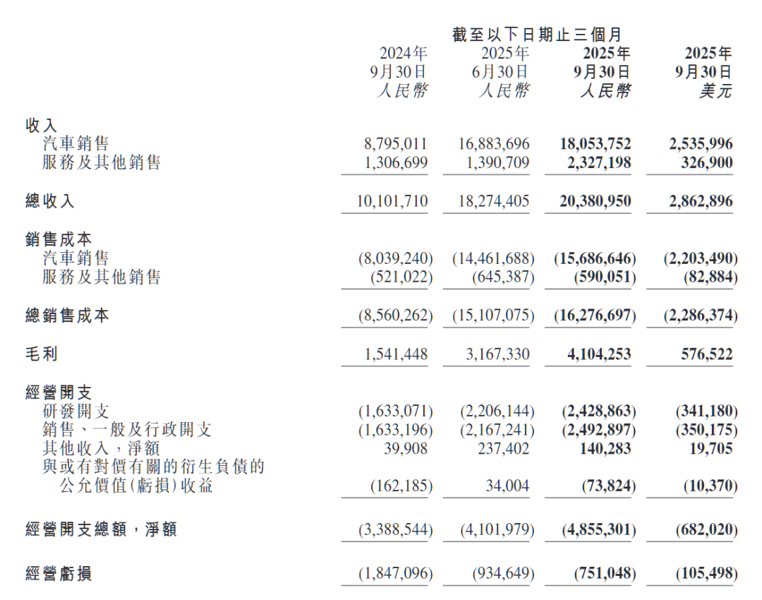 11月17日,小鹏汽车发布2025年第三季度财报,总营收为203.8亿元,同比增长翻番。汽车交付11.6万辆,创单季新高。虽然公司目前仍处于亏损状态,经营亏损为5.2亿(Non-GAAP),环比收窄3.2亿。但结合公司给出的12.5-13.2万辆交付的第四季度指引看,小鹏距离扭亏为盈已经指日可待。