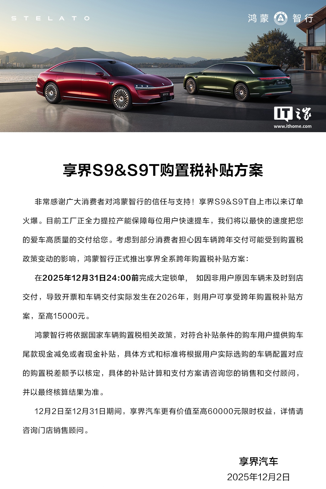IT之家 12 月 3 日消息,鸿蒙智行官方昨日发布了“享界 S9&S9T 购置税补贴方案”,称考虑到部分消费者担心因车辆跨年交付可能受到购置税政策变动的影响,正式推出享界全系跨年购置税补贴方案:
