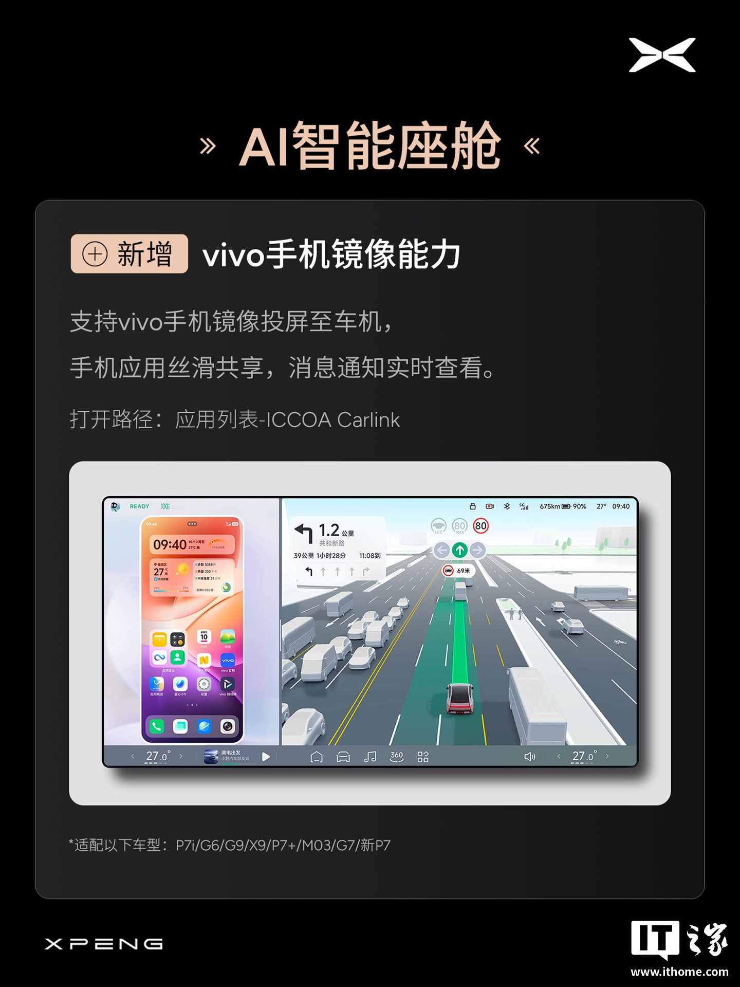 新增 vivo 手机镜像能力:支持 vivo 手机镜像投屏至车机,手机应用丝滑共享,消息通知实时查看。打开路径:应用列表-ICCOA Carlink。适配以下车型:P7i / G6 / G9 / X9 / P7+ / M03 / G7 / 新 P7。