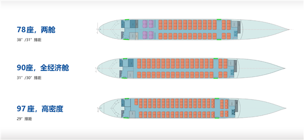 C909座级78-97座,航程2225—3700公里,最大起飞重量43500千克,具有适应性、舒适性、经济性、共通性、系列化等特性。