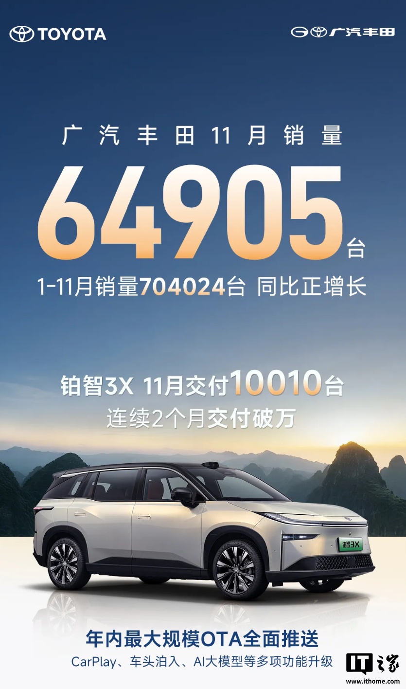 IT之家 12 月 5 日消息,广汽丰田今日公布了最新的销量“成绩单”。据官方数据显示,2025 年 11 月广汽丰田销量为 64905 台,较上年同期(2024 年 11 月销量 67493 台)下滑 3.8%;1-11 月累计销量 704024 台,官方宣称同比实现正增长。