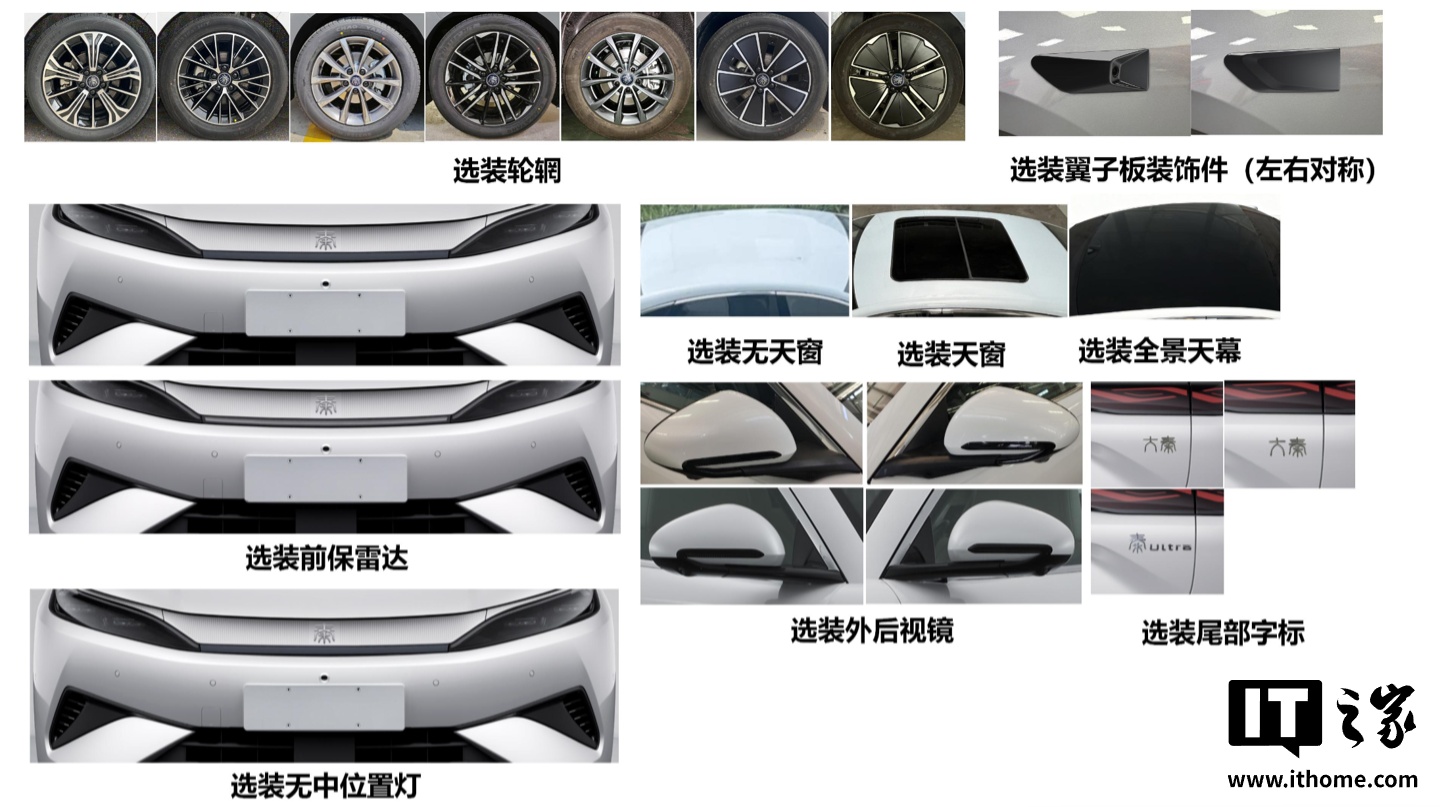 该车可选装多种轮毂、天窗、全景天幕,还可选装“大秦”“秦 Ultra”尾标。